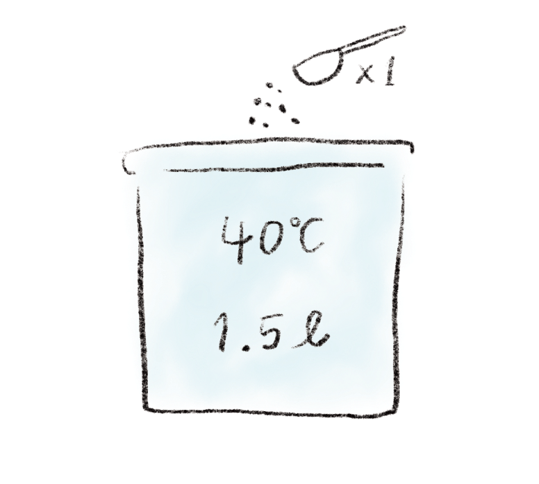 バケツの中に40℃のお湯1.5ℓに対し、重曹またはアルカリウォッシュ(セスキ炭酸ソーダ)大さじ1杯いれてよく混ぜます。